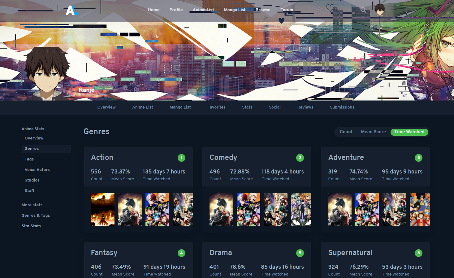 [O] Watch an anime that only has your 1st most watched genre by “Time Watched”
