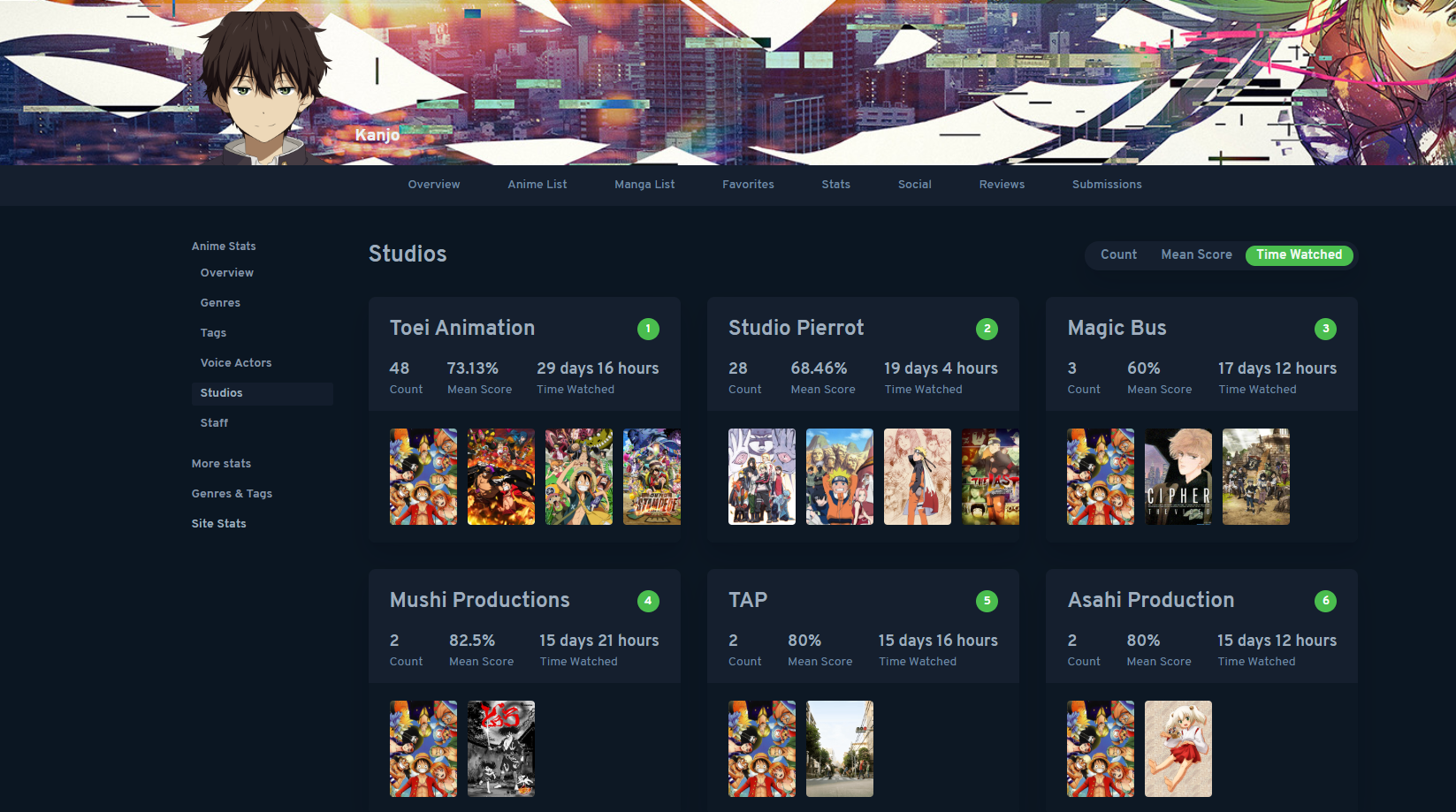 [🔴] Watch an anime by your 3rd most watched studio by “Time Watched”