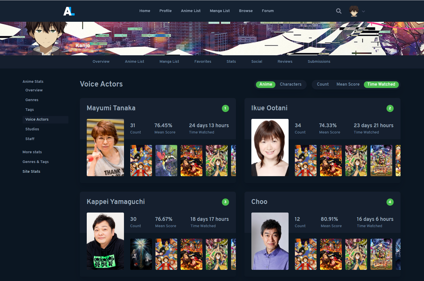 [O] Watch an anime featuring your 4th most watched voice actor by “Time Watched”