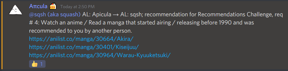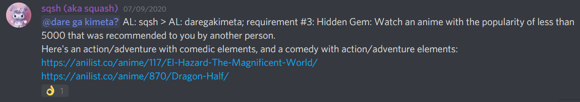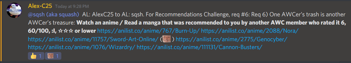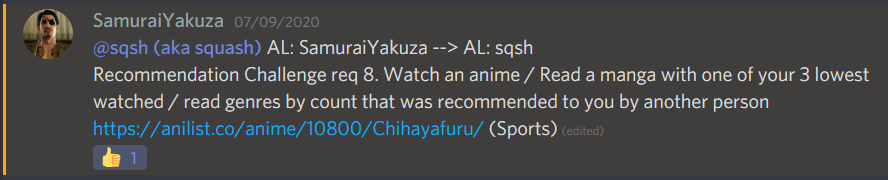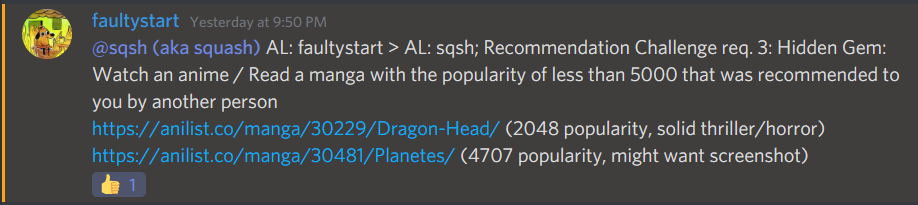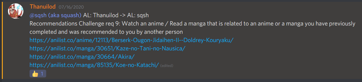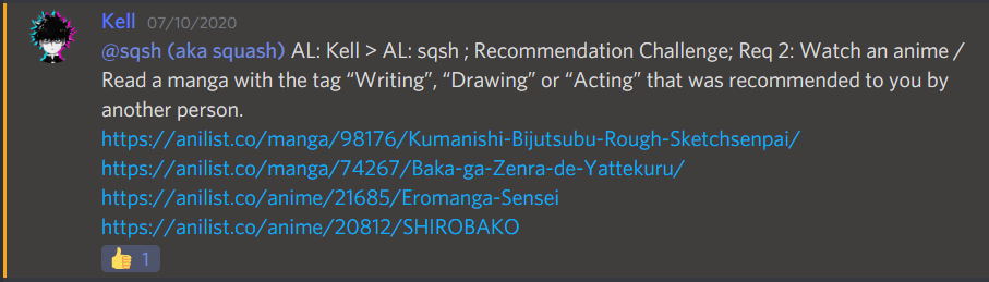 - Screenshot of the recommendation on Discord must include both recipient’s and giver’s Anilist username, the challenge, requirement number, the requirement itself for which the recommendation is needed and a link to the entry’s Anilist page. A recommendation on Anilist has to include the same information, but giver’s username is not necessary