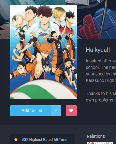 07) [X] Start: 13/08 Finish: 15/08 __Sponsorship: Watch an anime that features a fake well-known brand (such as WcDonalds)__ [Haikyuu!!](https://anilist.co/anime/20464/Haikyuu/) Real brand: [Sony](https://en.wikipedia.org/wiki/Sony), Fake brand: