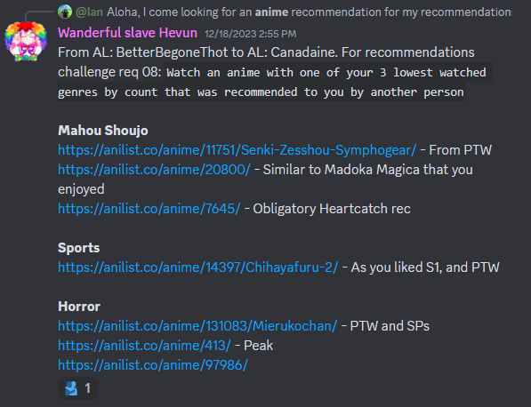If you are having a difficult time finding an anime to fulfil a certain requirement, please feel free to ask us on Discord, ask in our Challenge Discussion Thread, or ask a fellow AniList member for a recommendation.