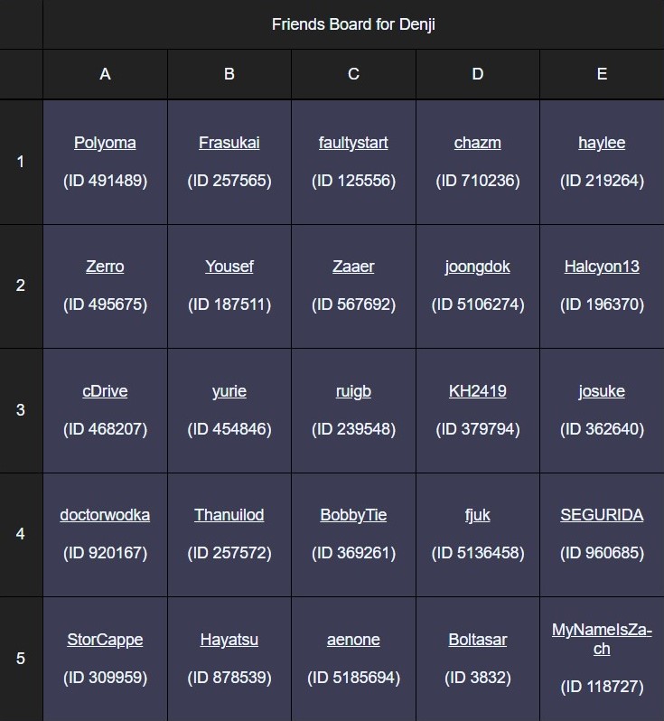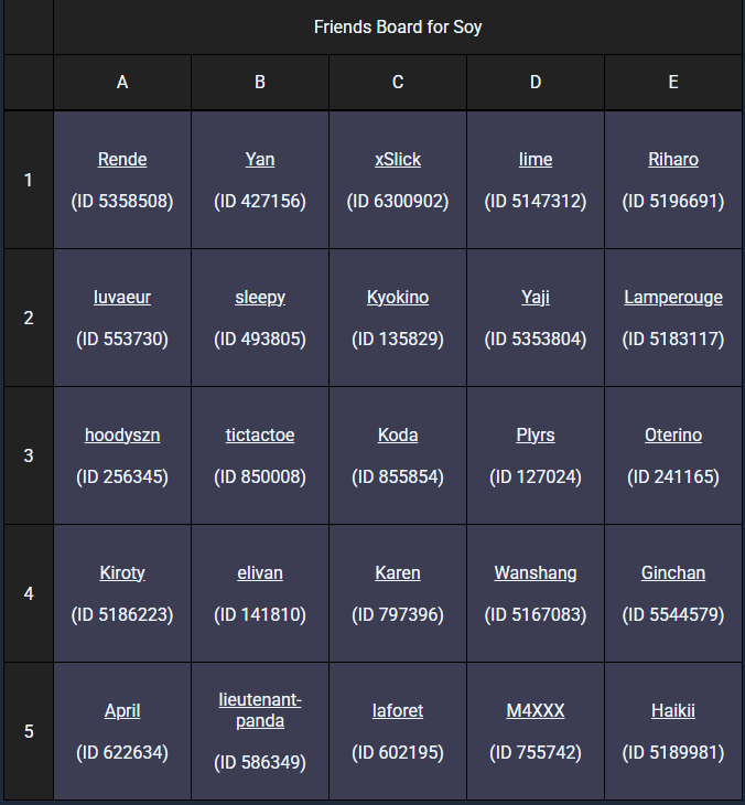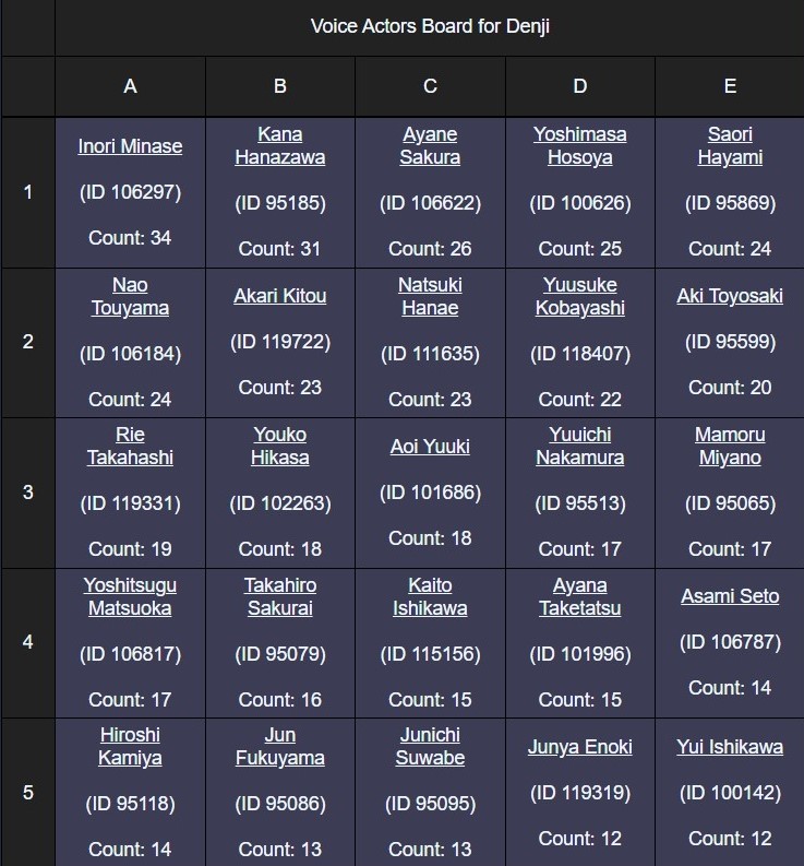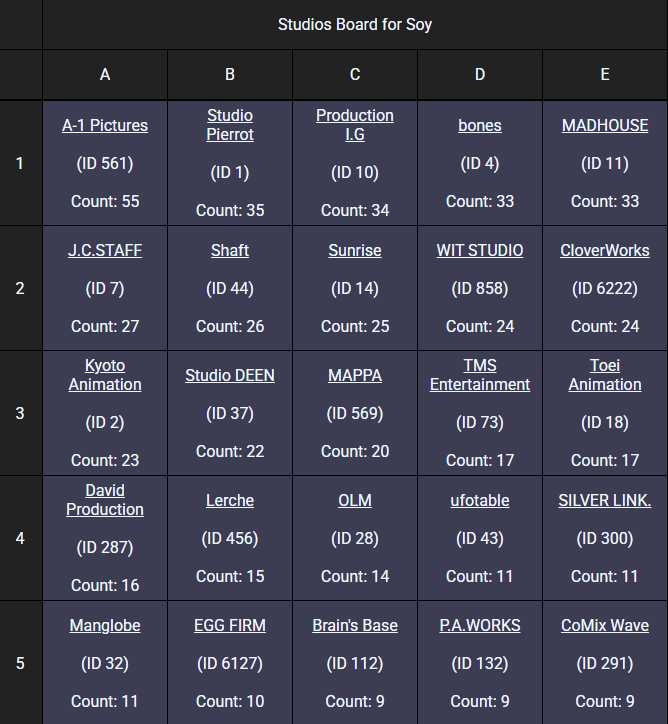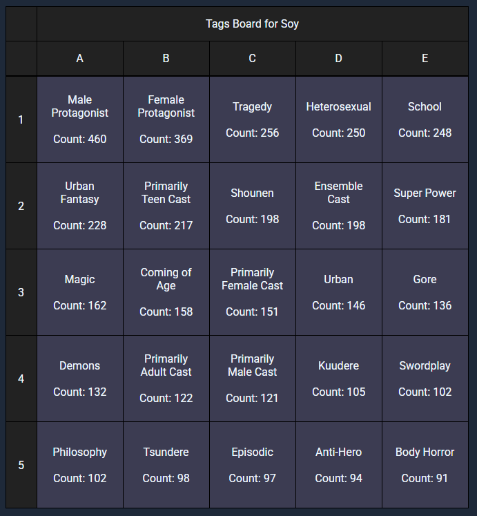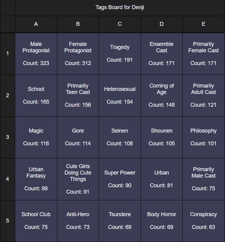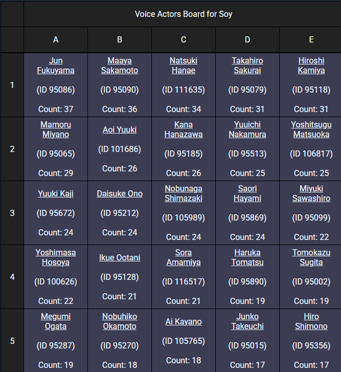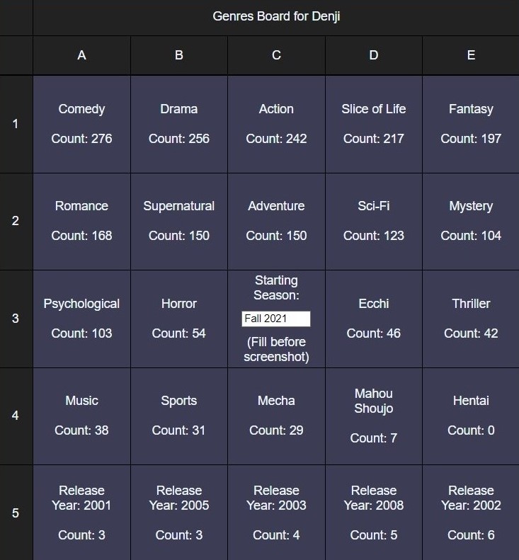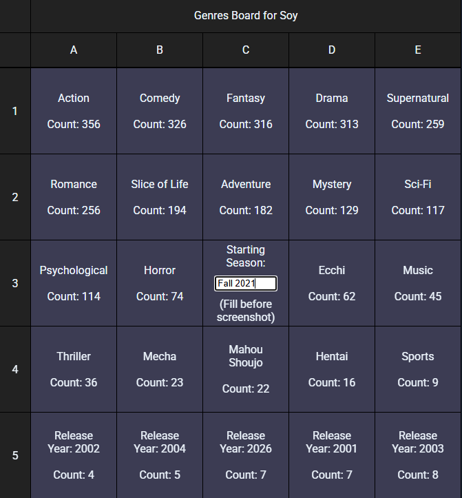 Gomoku, also called Five in a Row, is a strategy board game where players must try to place 5 Go pieces in a horizontal, vertical or diagonal line. While it is traditionally played on a Go board, for this challenge we’ll be playing on 5 special 5 x 5 personalised boards featuring your most watched genres, tags, voice actors and studios, as well as your friends’ favorite anime! You will have to create a horizontal, vertical or diagonal line of 5 on each board by watching an anime for each tile. The catch: Every line you create must be different!