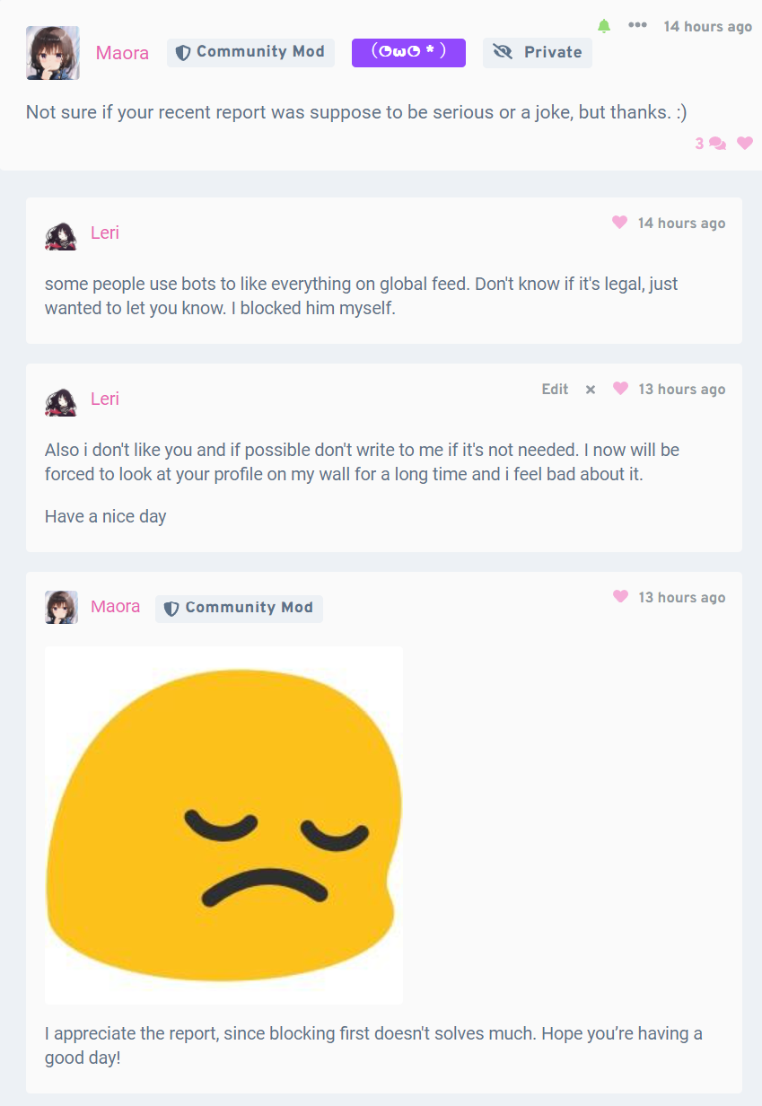 you know what. i also think you should be able to delete mod messages on your profile, cuz they really irritate me too, but dont be that butthurt about it. Maybe @Maora is really nice