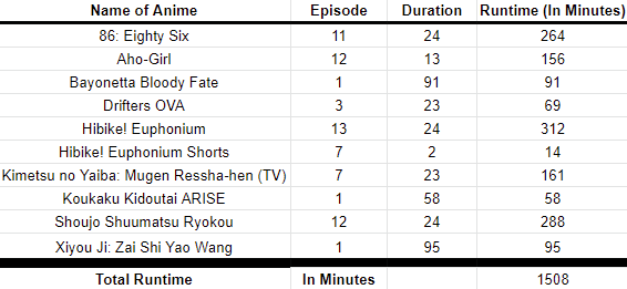 [X] Watch an anime with a total runtime equal to the number picked by another challenger