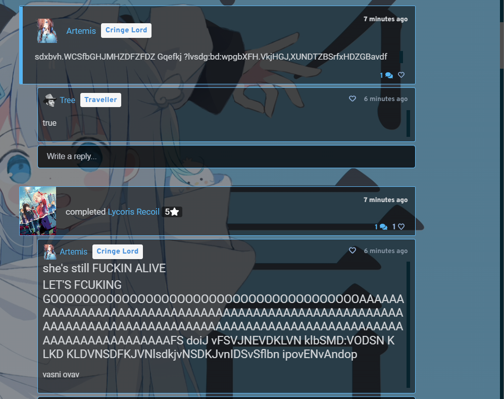 Lyco RecoI highly enjoyed the intensity of the first half alongside the casual conversation Chisato and Majima had. It was amazing stuff. But as for everything after that, I was kinda disappointed with how things wrapped up. Maybe I was wrong in hoping that it would be more sentimental after everything Chisato and Takina went through, but I don't know, their reunion and the interactions they had before the after credits scene felt empty as fuck. Really a shame that after all this engagement I felt throughout the show, it ends like this.