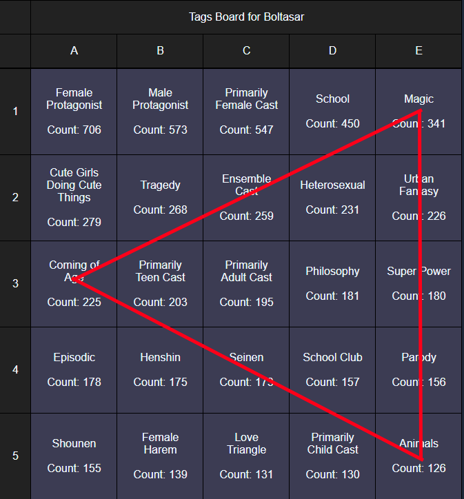 ✔️ Bermuda Triangle: Watch an anime with three tags on your Tags Board that are not lost in the “triangle”