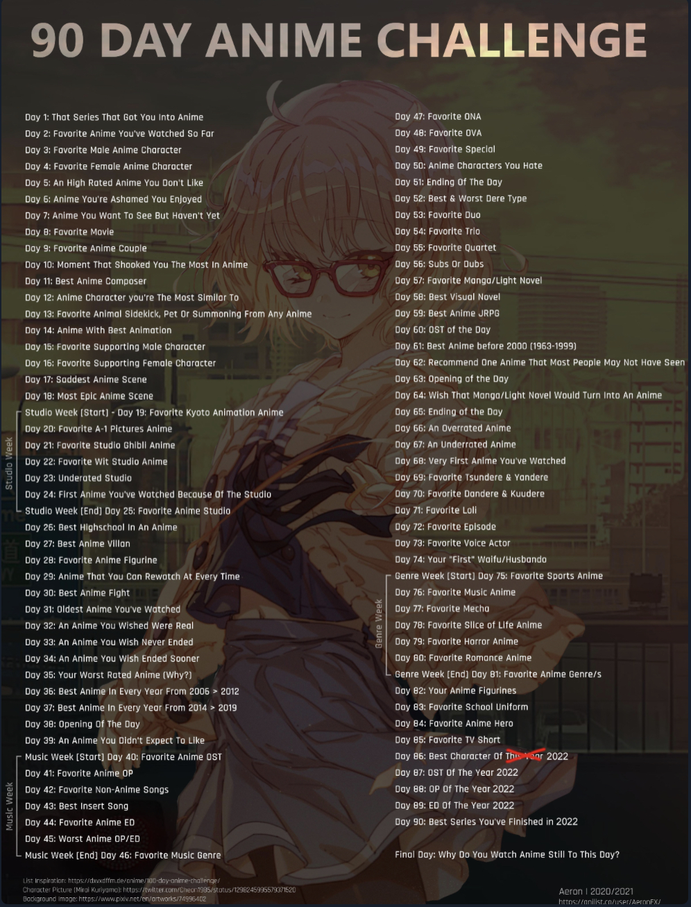 this is also why i made my own template of the original 90 day anime challenge, i disliked a lot of the questions. although i made it with questions i personally wanted to answer and am not sure how universal they are, feel free to grab some, about ~30% of the ones on the right side are my ideas