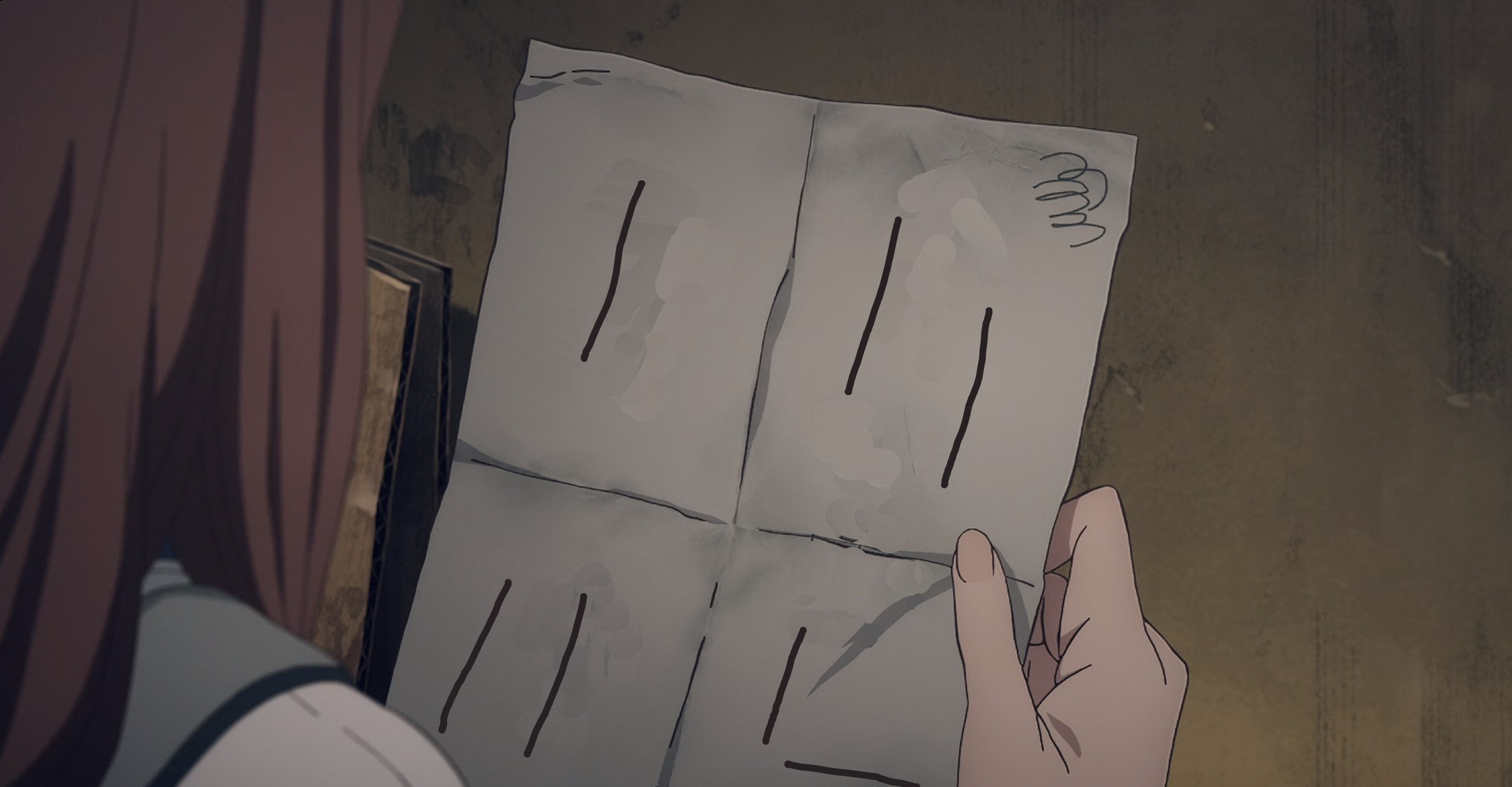 Maru and Kiruko plot their next course, and after running into a theatrical informant (I mean, how else would you describe his "information session" aside from hammy theatre? He even has a cassette tape play creepy music to add ambiance XD), we as audience members learn more about Heavenly Delusion's world - it's still not known what caused the disaster, but the effects are widespread and dangerous in many forms (ecological, geological, etc). Complicating things further is this picture of what appears to be Asura: