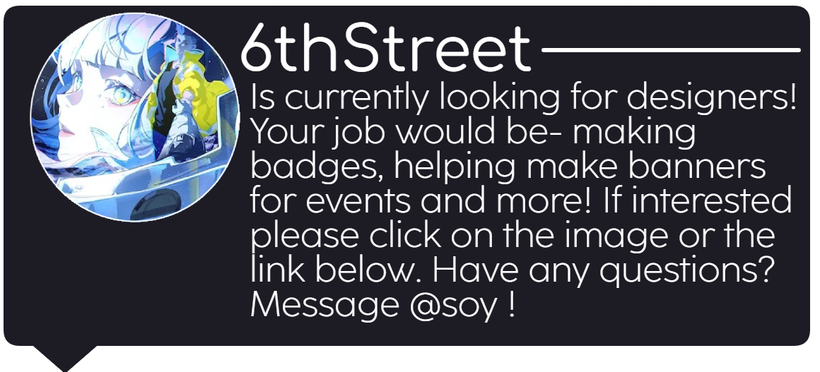 To participate in the events please make an activity with the event that is currently being hosted with an image or something that centers around it. Make sure you also put @6thStreet! In this fourm you'll find all of our Anilist events, please do not reply to this fourm thank you!