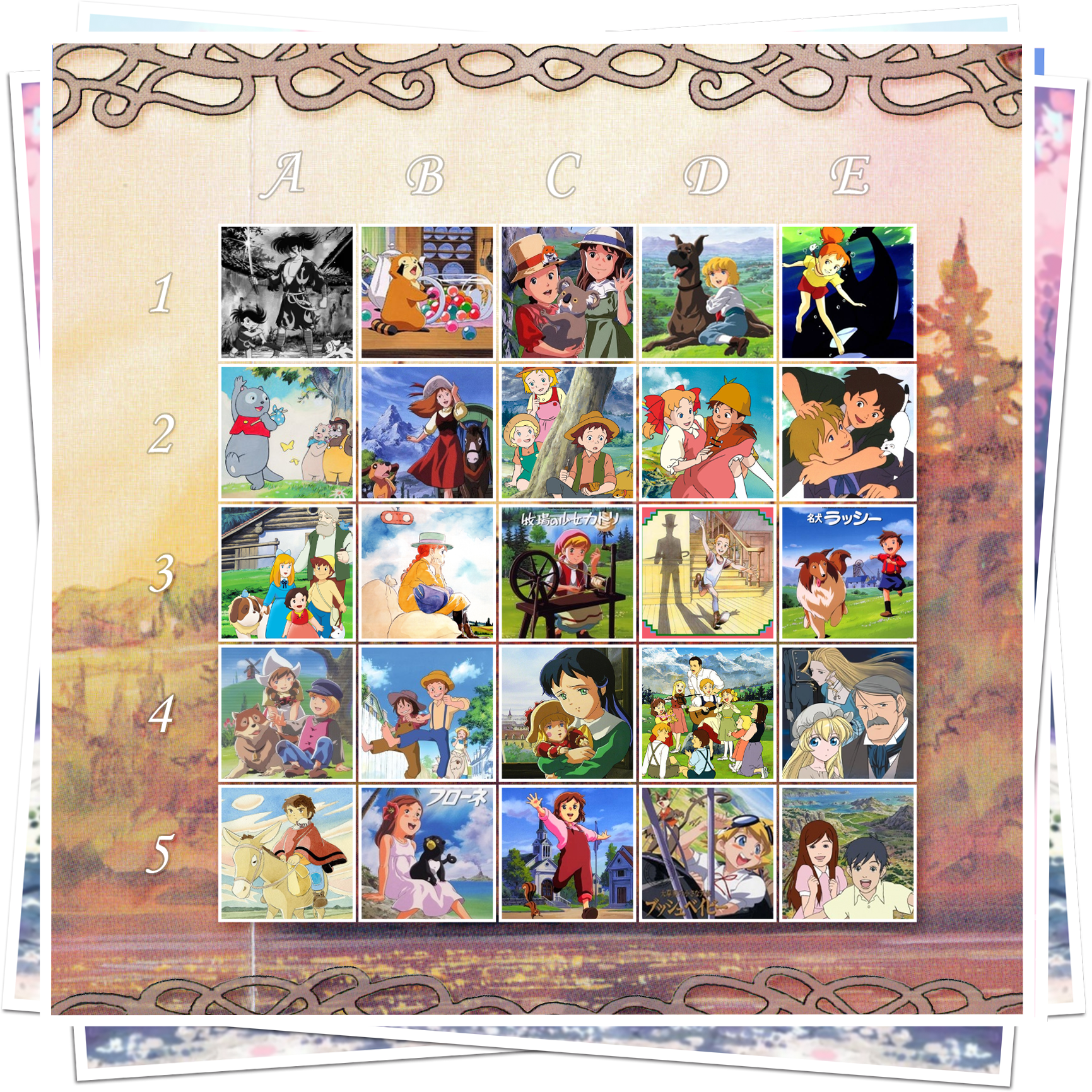 Note: The bingo board is based on anime that was deemed to best represent World Masterpiece Theater, but not every World Masterpiece Theater anime was included in this challenge.