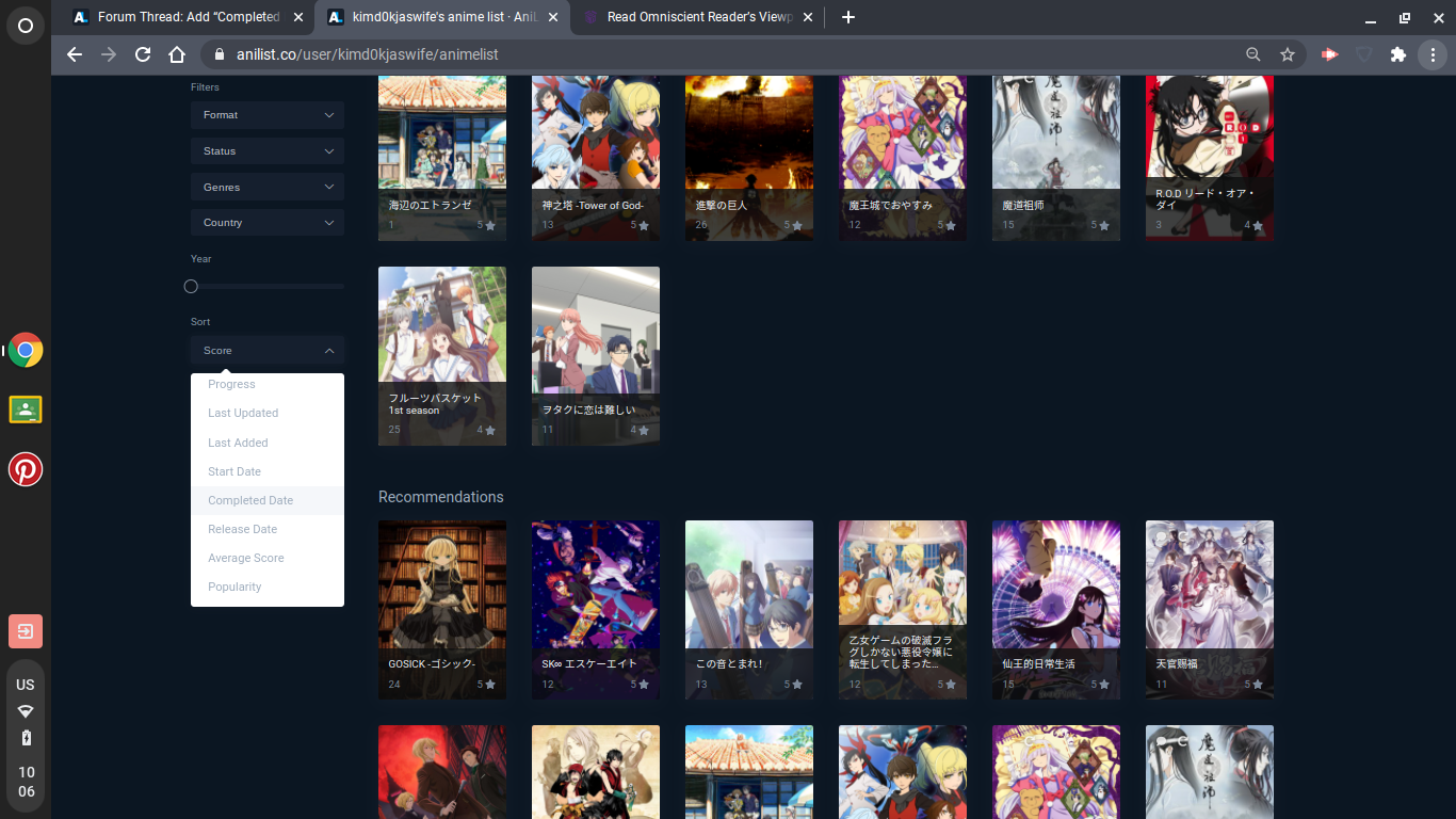 I currently sort by "last updated", but it's so annoying when I go back to adjust the score I gave a completed anime, and it bumps it up to the top of my list. sorting by "completed date" by default would be much more useful in my case.
