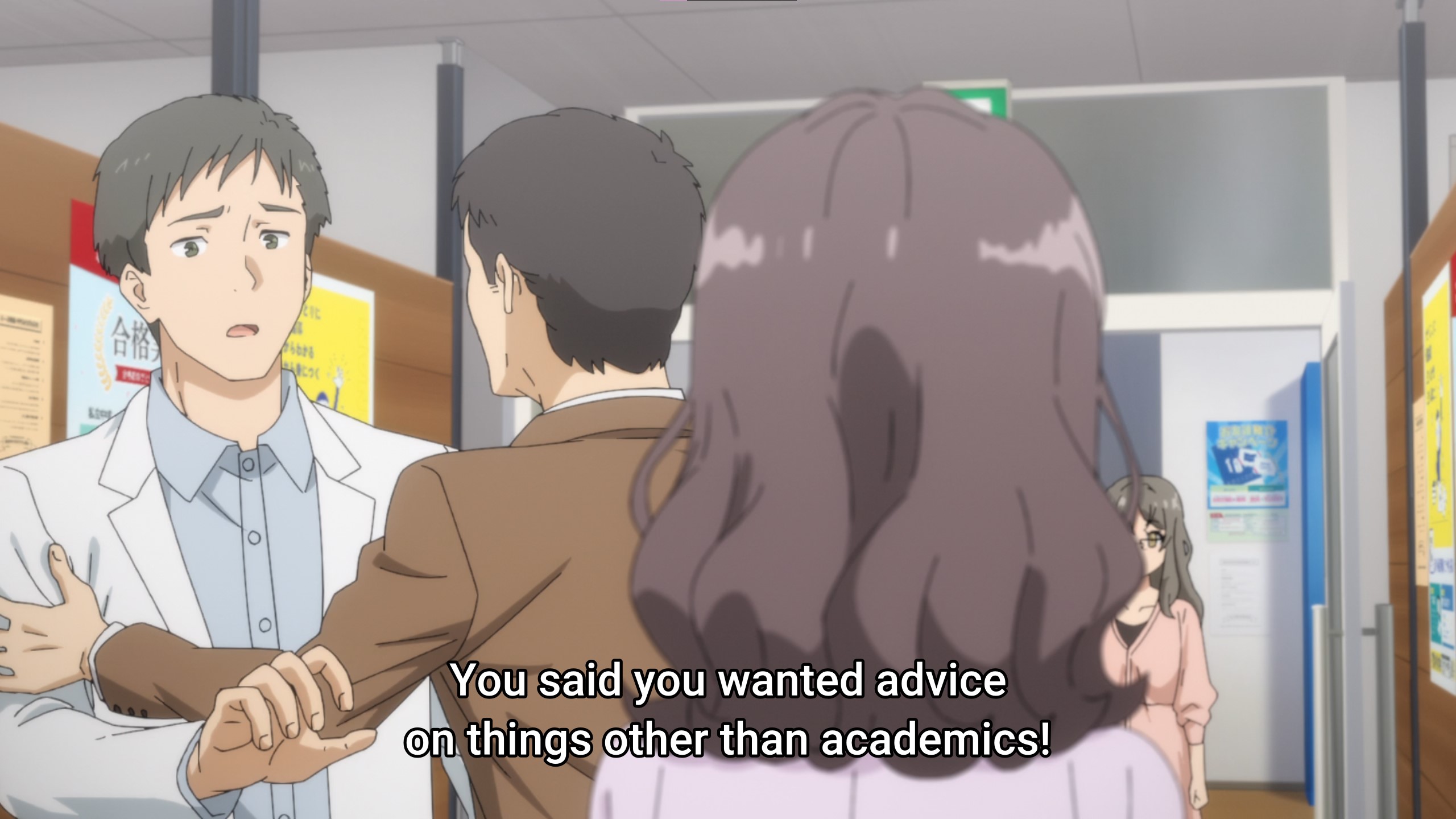 Wait, so the teacher did in fact try to make a move on her? And he got fired for it? I didn’t read the light novels up to that point, so I’m a little surprised to read that. And it’s interesting you should point that out, because now that Sakuta’s a teacher at that cram school. And I was thinking during that whole scene with him and Himeji, considering what Sakuta said about the fact that he “wouldn’t lay a finger on her“ in regards to the original teacher.