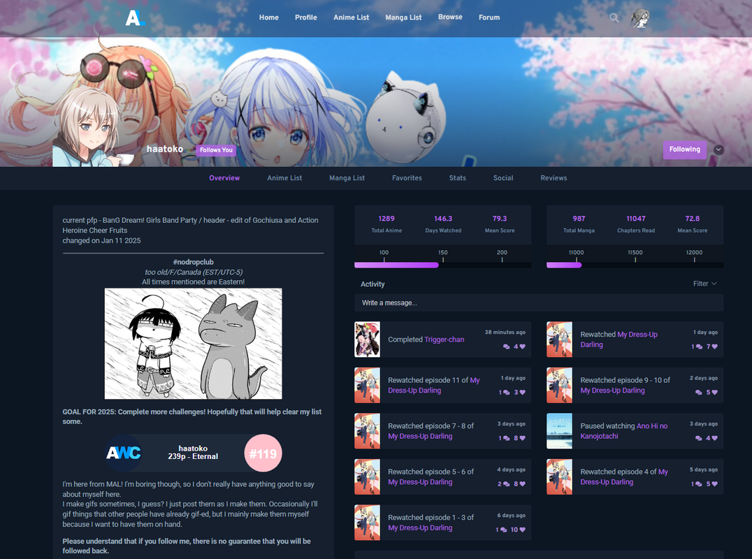 Your watching activity must be visible on your profile — This includes all episode progress and an activity showing each anime as completed