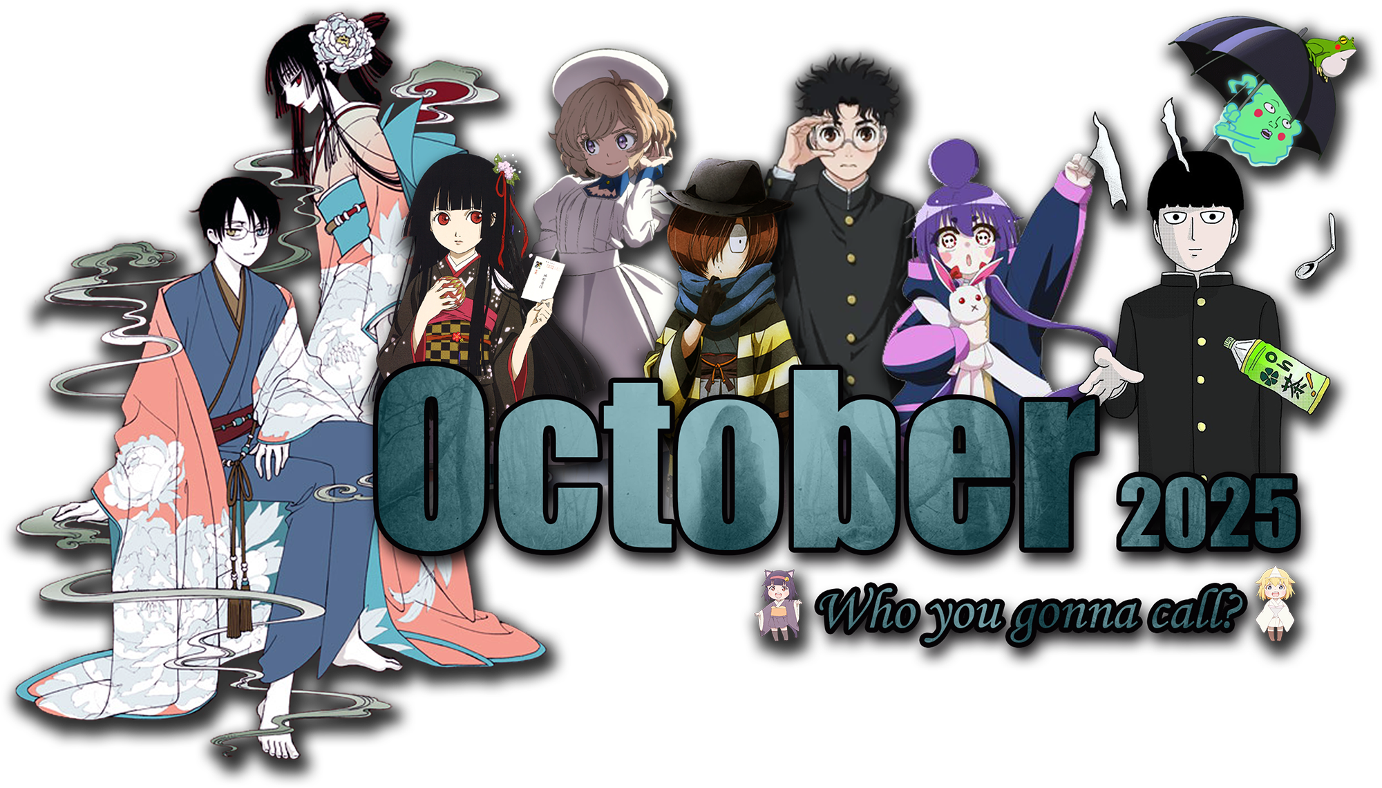 GFX: Kimihiro Watanuki and Yuuko Ichihara (xxxHOLiC), Ai Enma (Jigoku Shoujo), Kotoko Iwanaga (Kyokou Suiri), Kitarou (Gegege no Kitarou (1968)), Ken Takakura (Dandadan), Yayoi Houzuki (Dark Gathering), Shigeo Kageyama and Ekubo (Mob Psycho 100), Myako and Yuurei-chan (Shachiku-san wa Youjo Yuurei ni Iyasaretai.). Infobox: Acrobatic Sarasara, Jibakurei Kani, Ken Takakura, Tarou, Turbo Babaa, Serpo Seijin, Momo Ayase, Penny Chinkosu, Flatwoods Monster and Nessie (Dandadan)