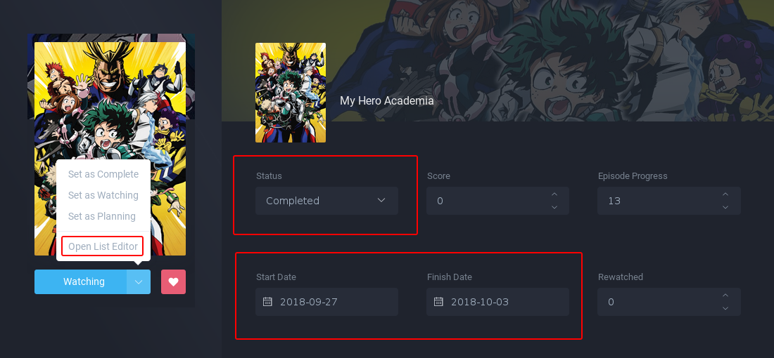 Regular - shows with 1 cour or less, movies and specials: You must have completed all episodes.
