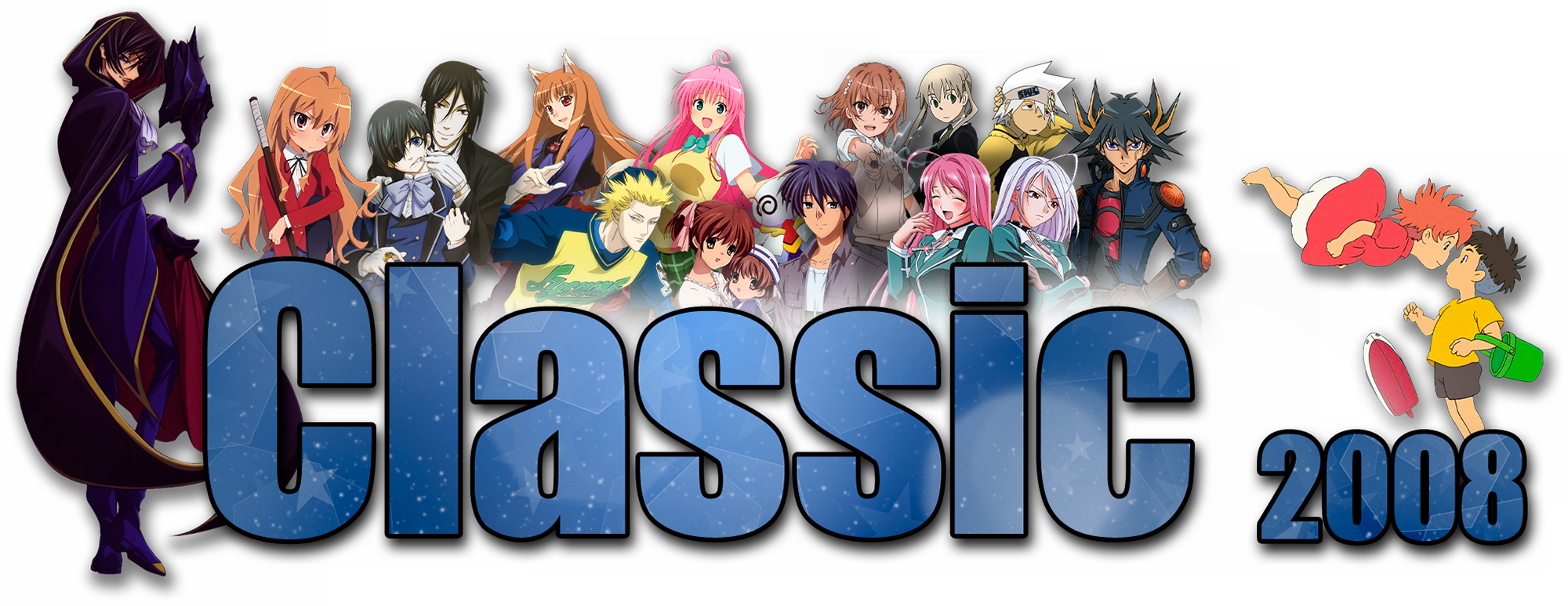 GFX: Lelouch Lamperouge (Code Geass: Hangyaku no Lelouch), Taiga Aisaka (Toradora!), Ciel Phantomhive and Sebastian Michaelis (Kuroshitsuji) Holo (Ookami to Koushinryou), Toua Tokuchi (One Outs), Lala Satalin Deviluke (To LOVE-Ru), Nagisa Furukawa, Ushio Okazaki and Tomoya Okazaki (CLANNAD: After Story), Mikoto Misaka (Toaru Majutsu no Index), Maka Albarn and Soul Eater Evans (Soul Eater), Moka Akashiya (Rosario to Vampire), Yusei Fudou (Yu☆Gi☆Oh! 5D's), Ponyo and Sosuke (Gake no Ue no Ponyo)