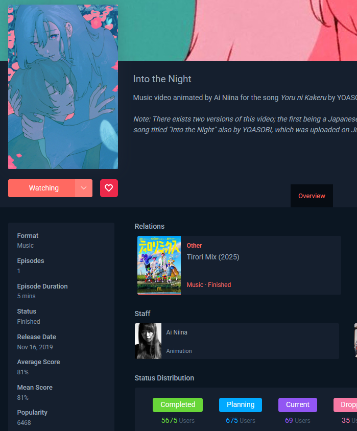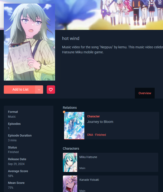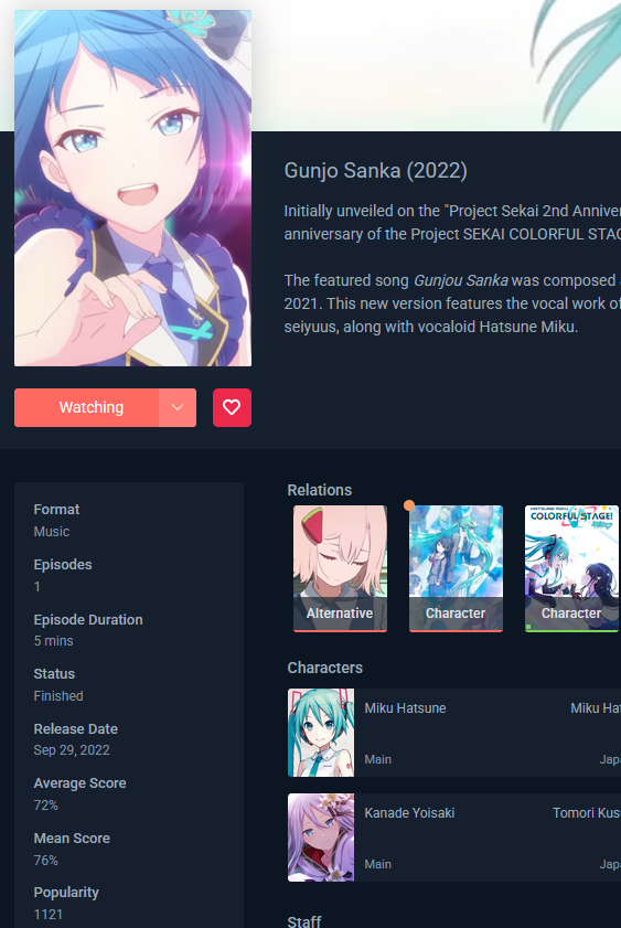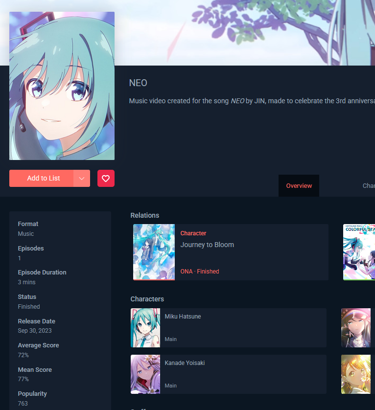 ] Watch a Music Video with a character that appears in at least 5 other entries on AniList
