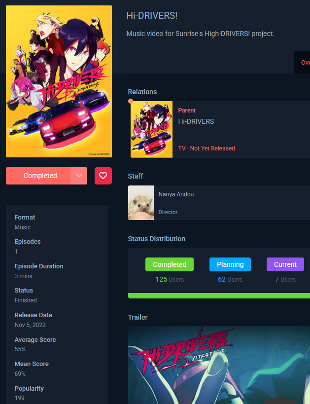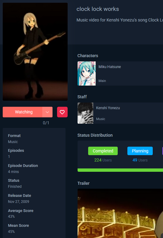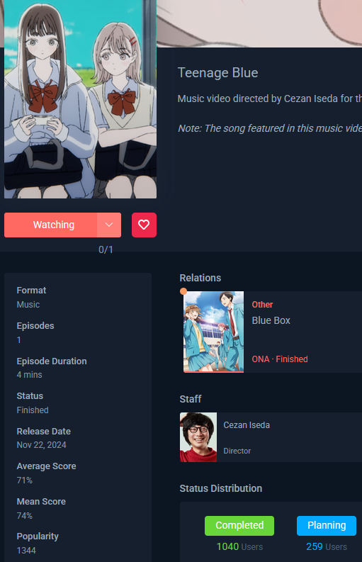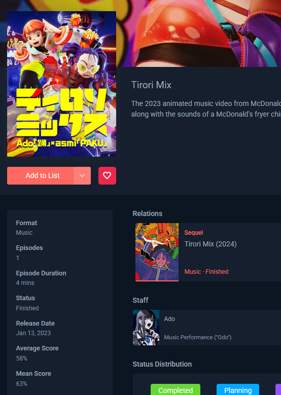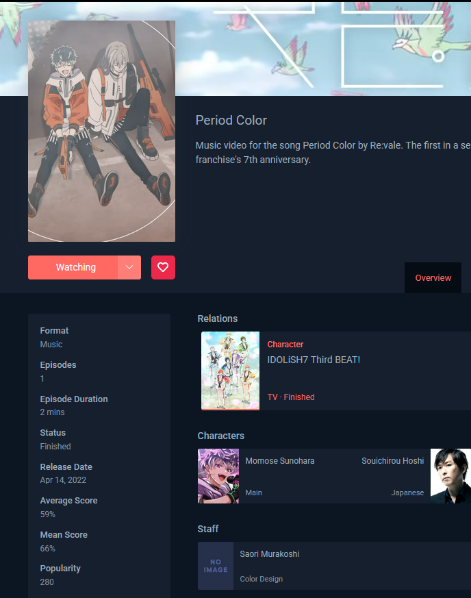 Start: YYYY-MM-DD Finish: YYYY-MM-DD // Studio: Studio // Music Video 1: Anime_Title // Music Video 2: Anime_Title // Music Video 3: Anime_Title