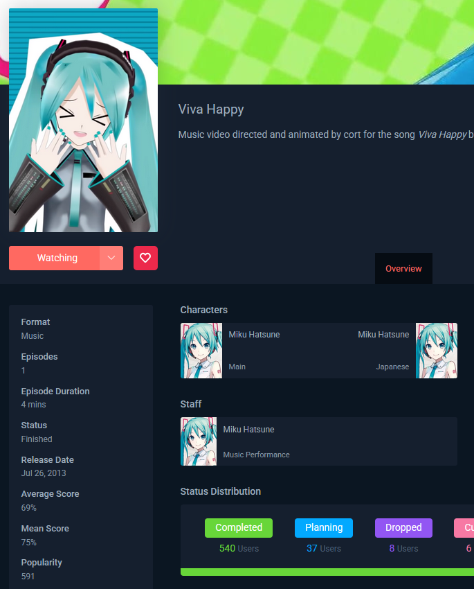 *Vinyl scratch sound* You are now listening to- I mean, watching *ayaya sound effect* 103.4 AWC RADIO- I mean, TV *Puppie noise* Today we- I mean, you get to watch the latest Charts filled with 100 of the finest Music Videos to be found on AniList! Who’s gonna find and sort them? Well you of course!