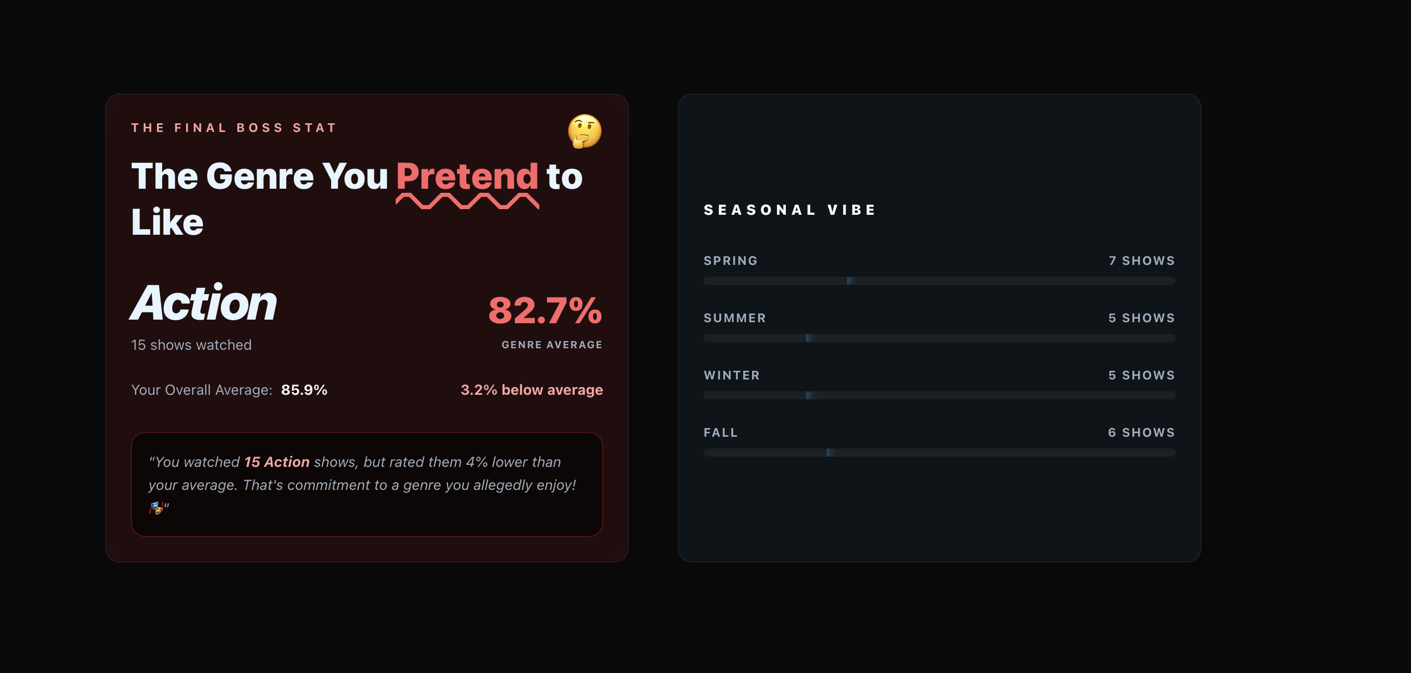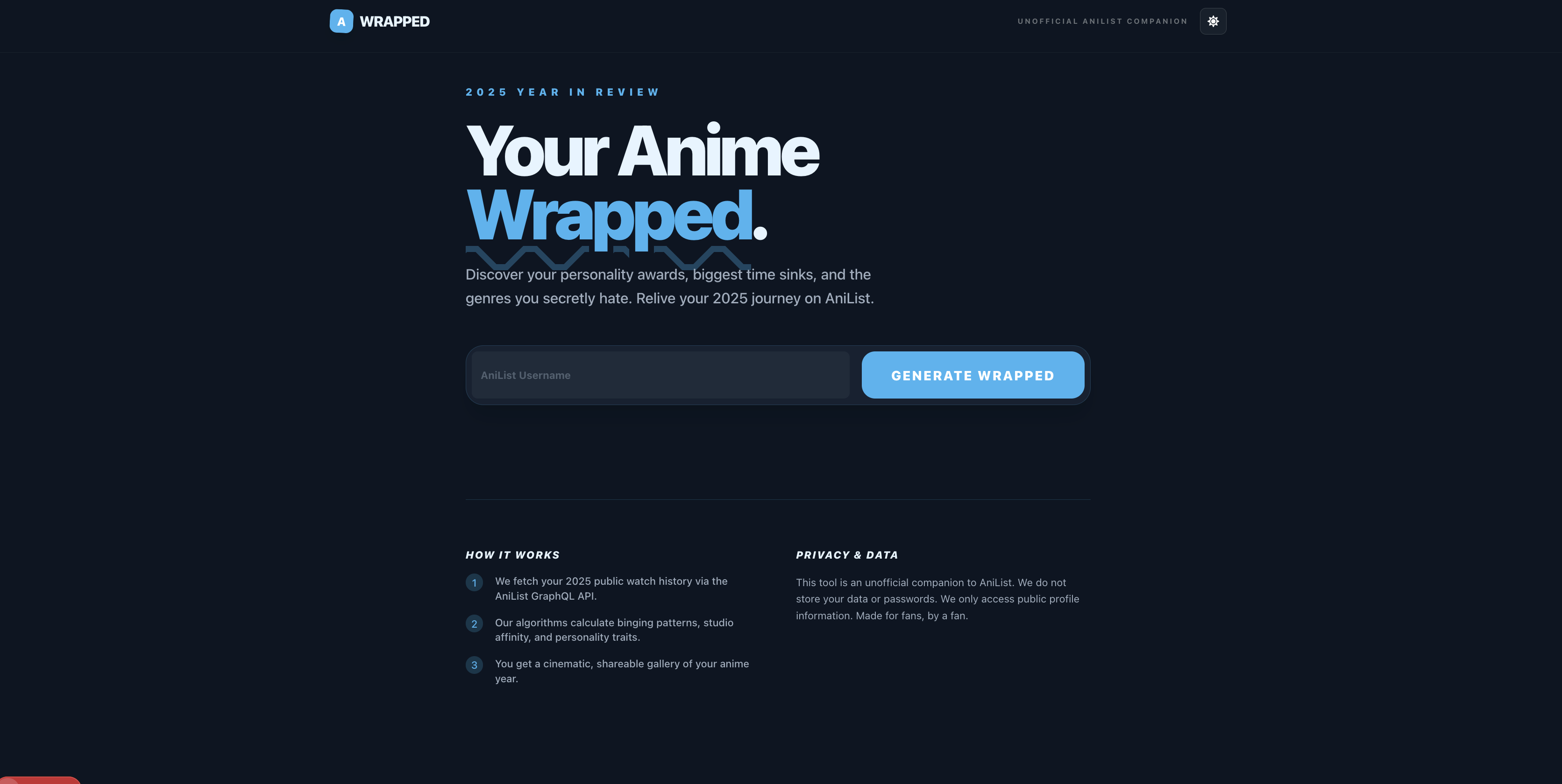 I've always loved the "Wrapped" aesthetic and wanted to make something that whether you're a seasonal addict or a vintage masterpiece seeker, you could see those stats come to life. Check out my version of Anilist wrapped!