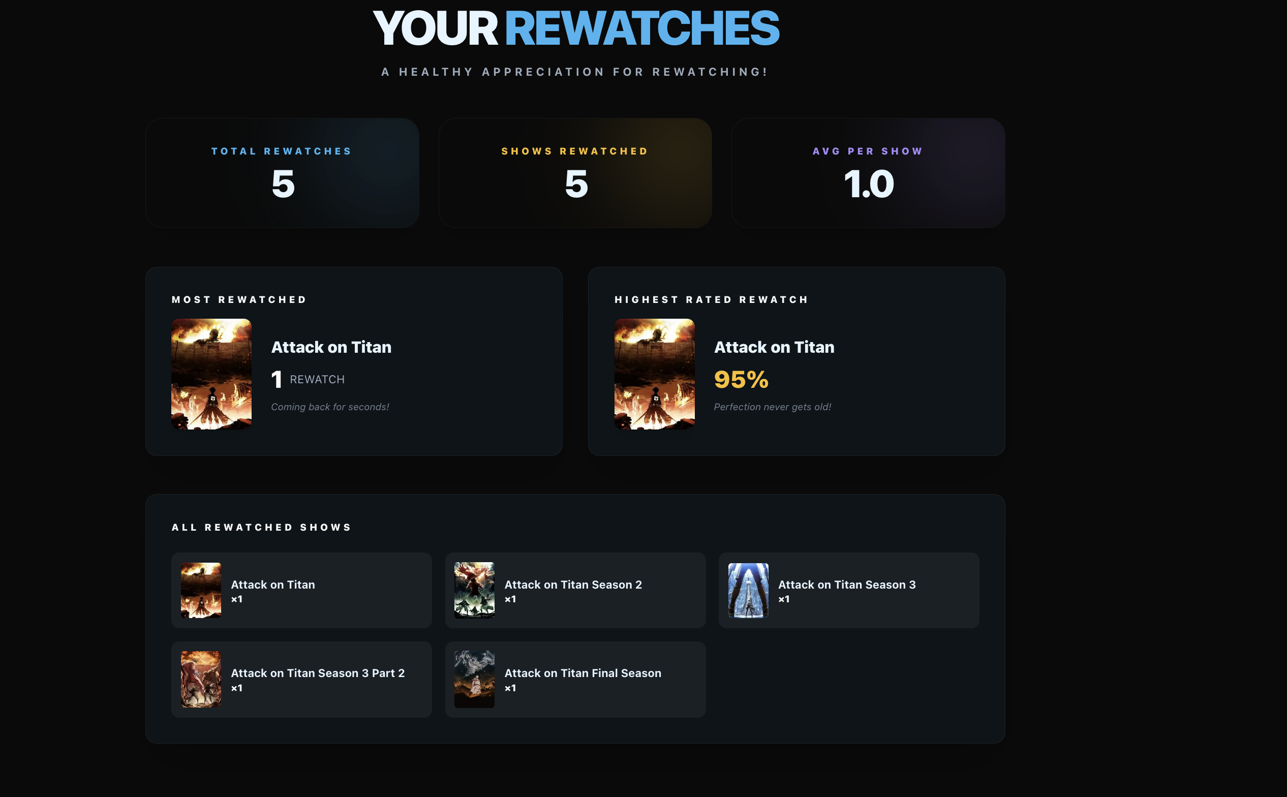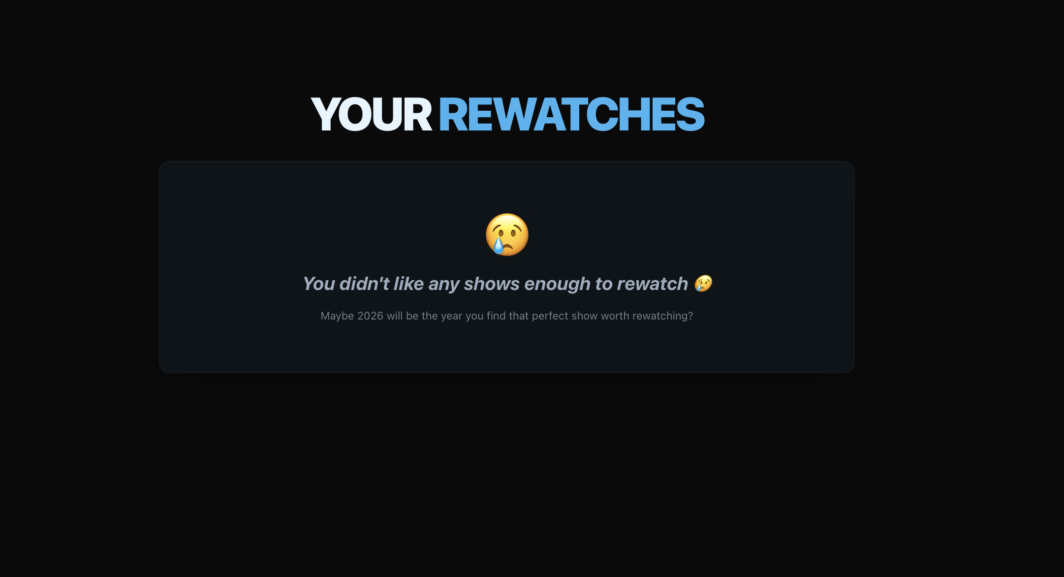 Thanks for the feedback haha I'm glad you like it! The rewatches thing is a good idea and I'm gonna check the docs to see if I can get data for that an introduce another section. The duplication show stuff should be fixed now :) Give it a try!