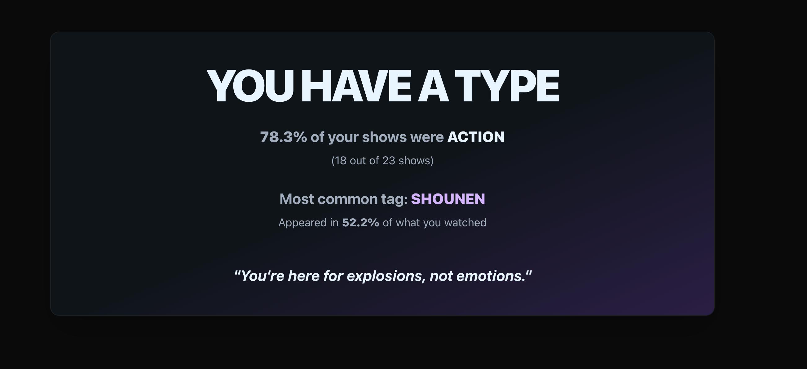 A suggestion for next year: Maybe revamp the "Top Tags" list priorities? I think a lot of people are likely to get Male or Female Protagonist as their most watched Tag just cus almost every single show has one or the other, and that tag doesn't really say much for what kind of show people watch the most of. So maybe suppress specifically those kinds of tags from the "Top Tags" list?