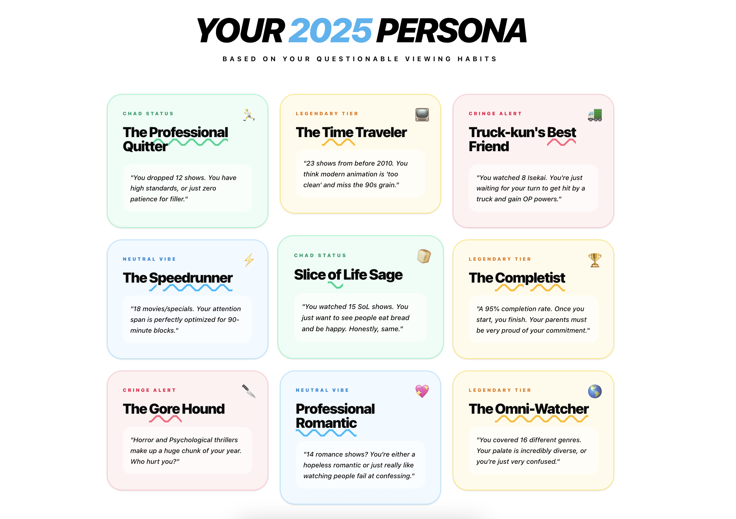 This is really well done! I do love the personality awards, though I will say I have the "Gore Hound" one and I'm not sure why, I primarily watch romance and comedy shows, there's maybe one or two shows in my entire completed list that have the horror or thriller tag, and the vast majority of "psychological" tagged shows I have are the "Rascal Does Not Dream" series and Medalist, neither of which are particularly gory, lol. Maybe just an issue with AniList's tagging, "psychological" is not a very descriptive genre tag.