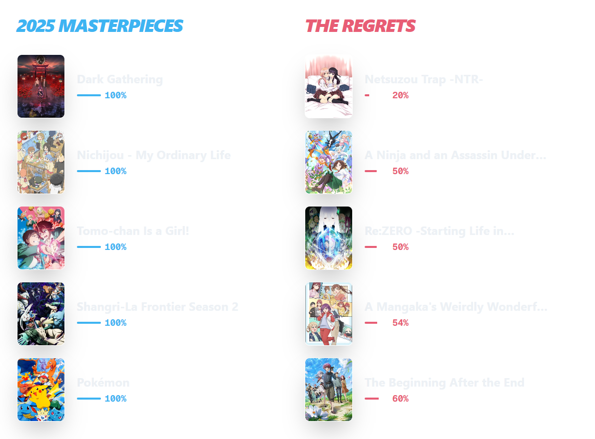 This is pretty cool! However, i'd like to suggest adding a dark palette for the site, as the names of the animes in the Masterpiece and Regrets section are kinda hard to read. Other than that, this is very solid