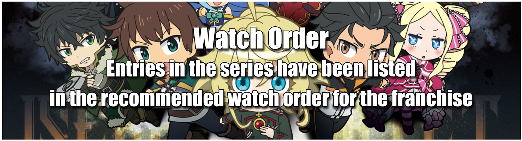 GFX: Viktoriya Serebryakov, Johann Weiss and Erich von Lergen (Youjo Senki), Shalltear Bloodfallen, Albedo and Demiurge (Overlord), Darkness, Aqua and Megumin (Kono Subarashii Sekai ni Shukufuku wo!), Rem, Emilia, Ram and Puck (Re:Zero kara Hajimeru Isekai Seikatsu), Filo, Naofumi Iwatani, Raphtalia, Cid Kagenou and Alpha (Isekai Quartet series). Infobox: Reiner Neumann, Wilbald Koenig, Johann Weiss, Warren Grantz, Shalltear Bloodfallen, Darkness, Cocytus, Mare Fiore, Ram, Raphtalia, Demiurge, Aura Fiore, Filo, Rem, Albedo, Aqua, Megumin, Puck, Emilia, Viktoriya Serebryakov, Naofumi Iwatani, Kazuma Satou, Tanya von Degurechaff, Subaru Natsuki and Beatrice (Isekai Quartet series)