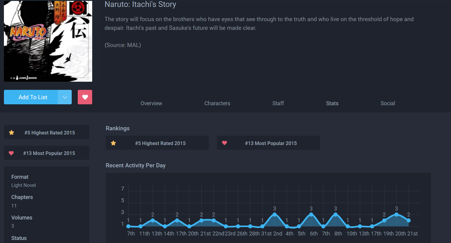 9. [X] Start: 23/08/2019 Finish: 23/08/2019 __Ocean waves: Read a manga that has at least 3 major rises and falls in its activity stats__ [Naruto: Itachi's Story](https://anilist.co/manga/87232/Naruto-Itachis-Story/) Screenshot: