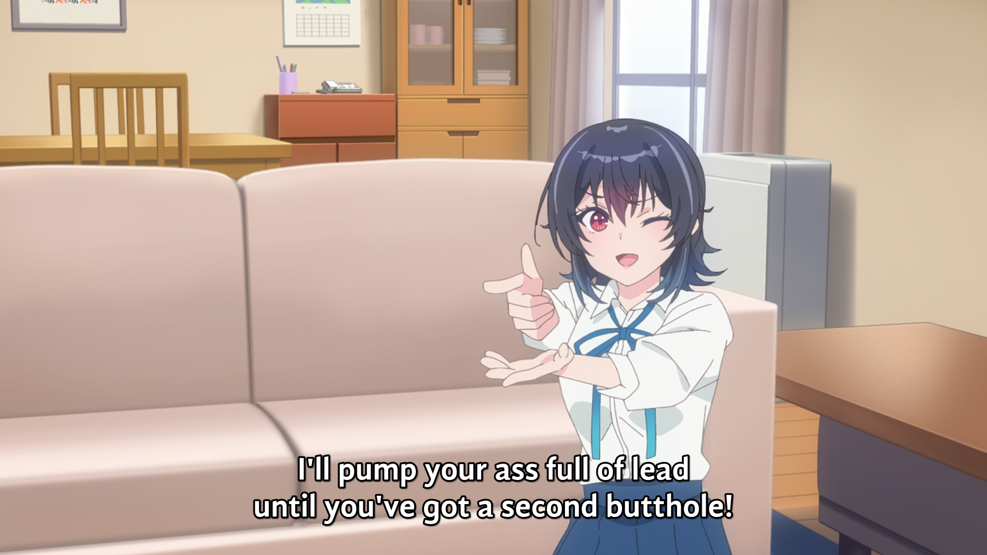 Liked it. My big issue is really just how it looks; I'd say the character designs look off at time for me and I'm not a fan of like how the characters look bright or the lighting on them looks(What I'm referring to is there looks like a glare on their designs at certain points, feels very distracting). Overall, a good episode, like the main girl, she is cute and honestly, I love the fact that both MCs just are together because they share the same interest and it looks like she might help get Maehara out of his comfort zone. Also, the image above, when she said this, I died laughing. Never have I seen a slice of life anime say this before LMAO. Also, the small section with the text message was really cute as well. Asangi dressed up like Shark was really cute in that section.