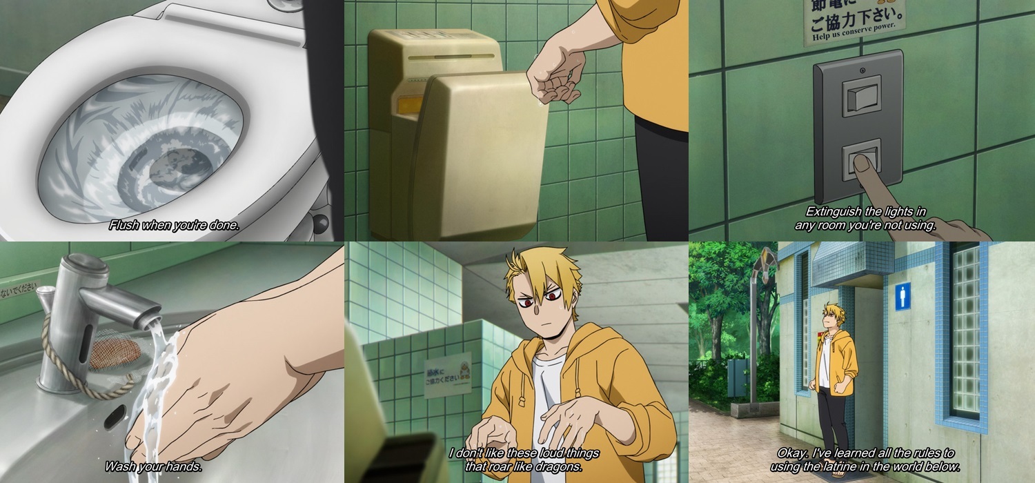 But beyond that, I also like the smaller things. The way our characters are shocked by how the modern world works and trying to understand how everything works is so much fun to watch. Yuru being so proud of himself for learning how to use the toilet is so funny XD. But my absolute favorite characters here are Left and Right. They're so cool and so funny at the same time.