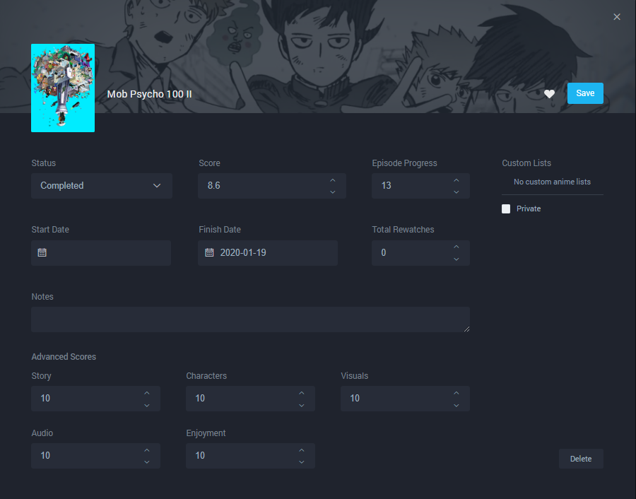 The overall score seems to turn out different depending on anime despite giving each category the exact same score e.q. 10 in everything for Oregairu S1 will yield 8.4. Or 8 in everything equals 9 or 8.7 depending on anime.